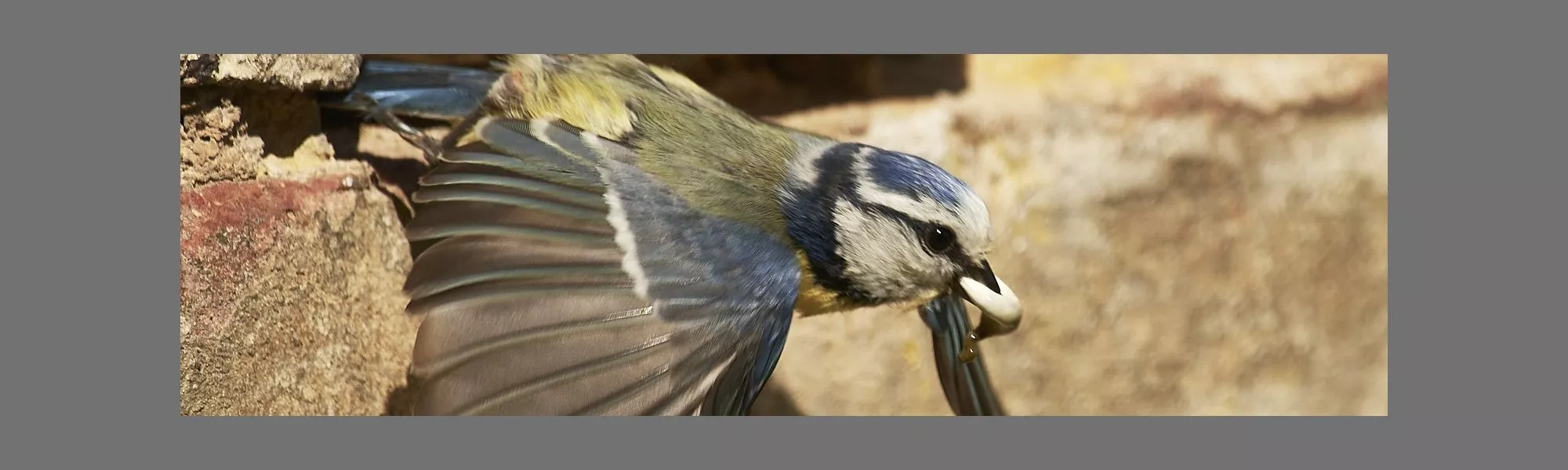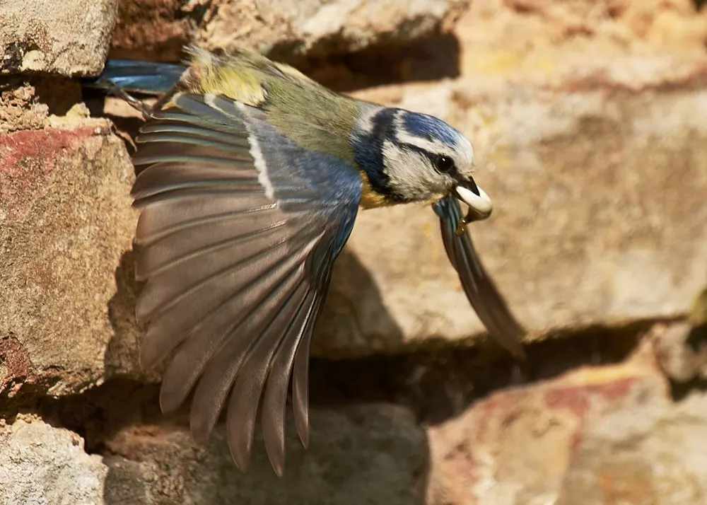 Un couple de mésanges bleues a installé le nid dans une anfractuosité d’un mur de mon jardin. On voit ici l’un des parents emportant un sac fécal d’un des enfants afin de garder la maison propre. La dévotion des parents pour leur progéniture est admirable car les allers et retours ont lieu chaque minute.