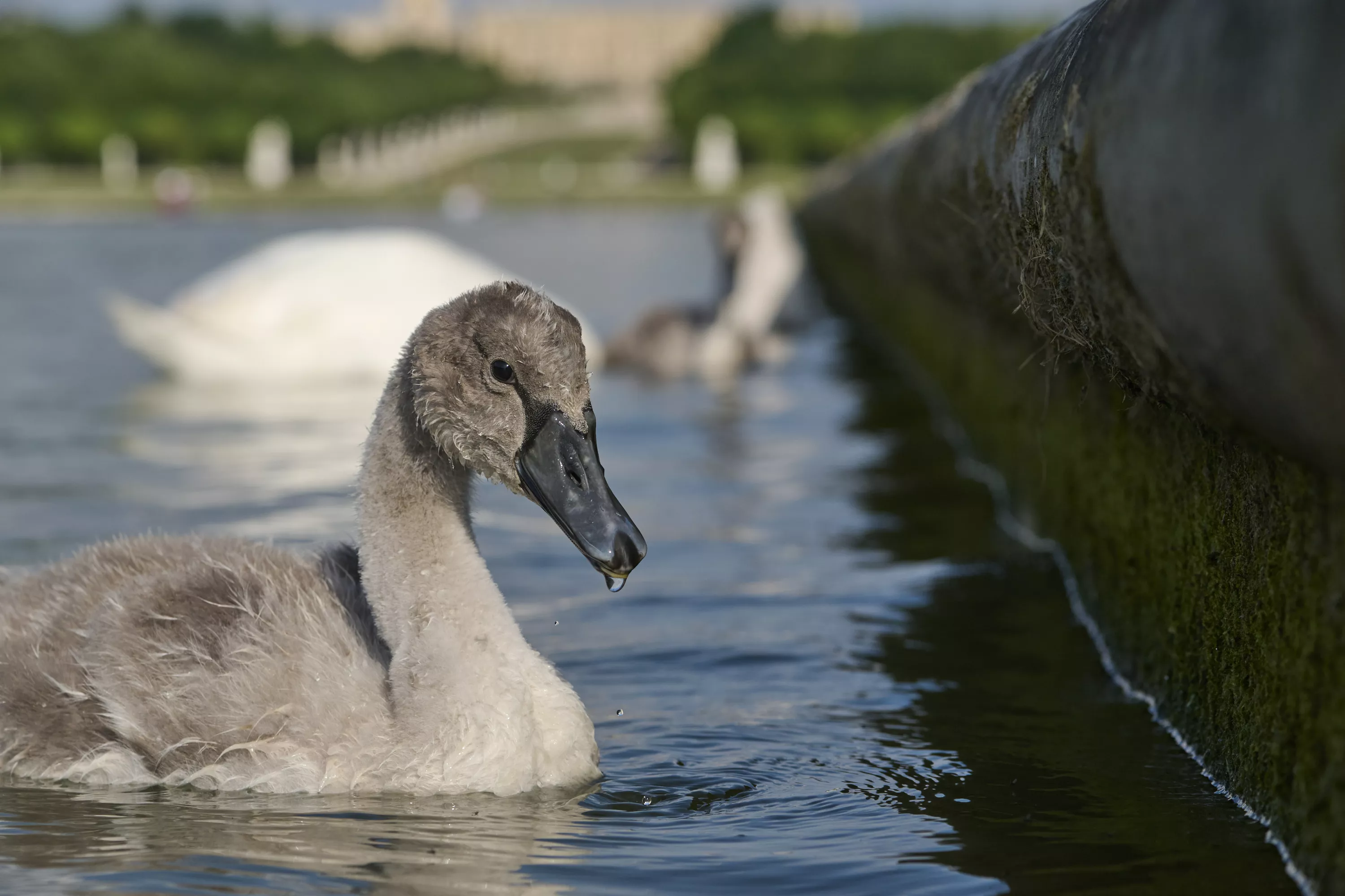 Jeune cygne de l’année, Grand Canal sur fond de Château.